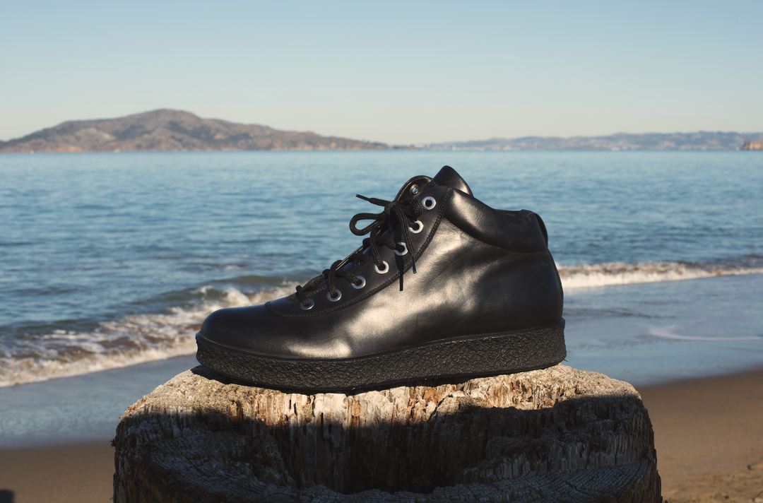 Text prompts and vibes encompassing leather biker accessories, chrome, waxed and distressed cow hide, embroidery, traditional leather tooling. Elements of a less structured and contemporary material - with a neoprene shaft and it's association with surfing and diving intended to give the boots a more experimental and playful feel.