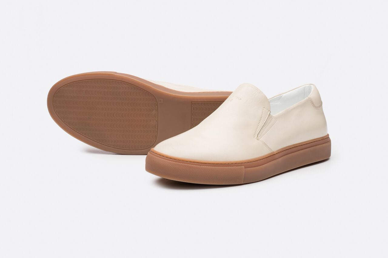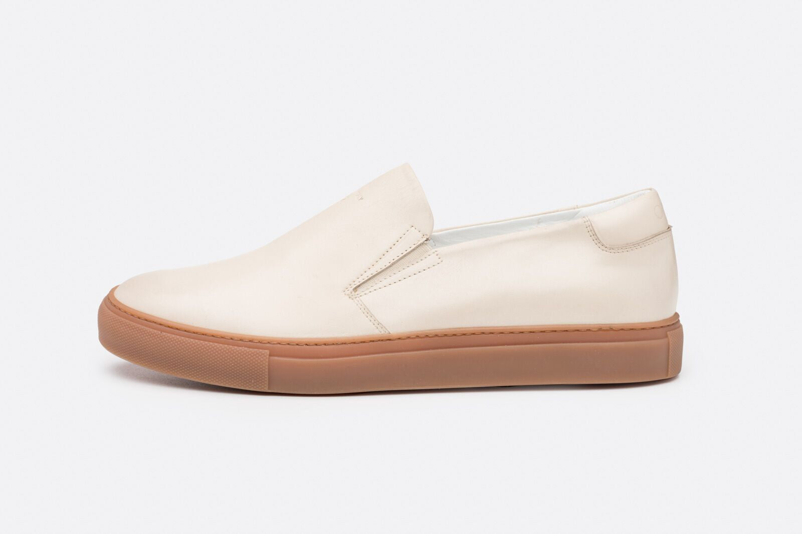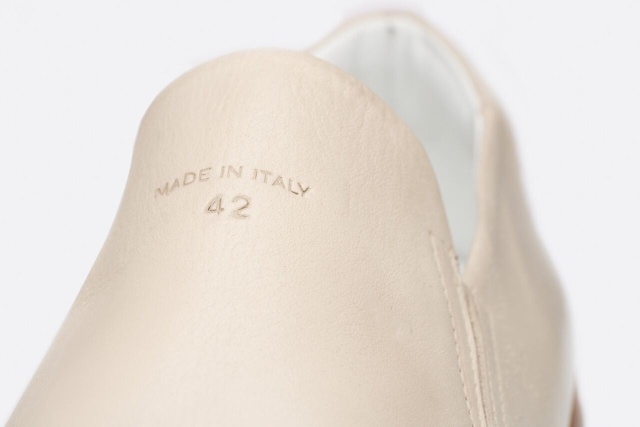 This ‘Barbee’ model is a classic slip on made from smooth, vegetable tanned, calf leather. Our hand stamped ‘Made In Italy’ emboss is sure to add personality to any closet. Featured in an off white/panna color. Leather lined. Margom outsole.