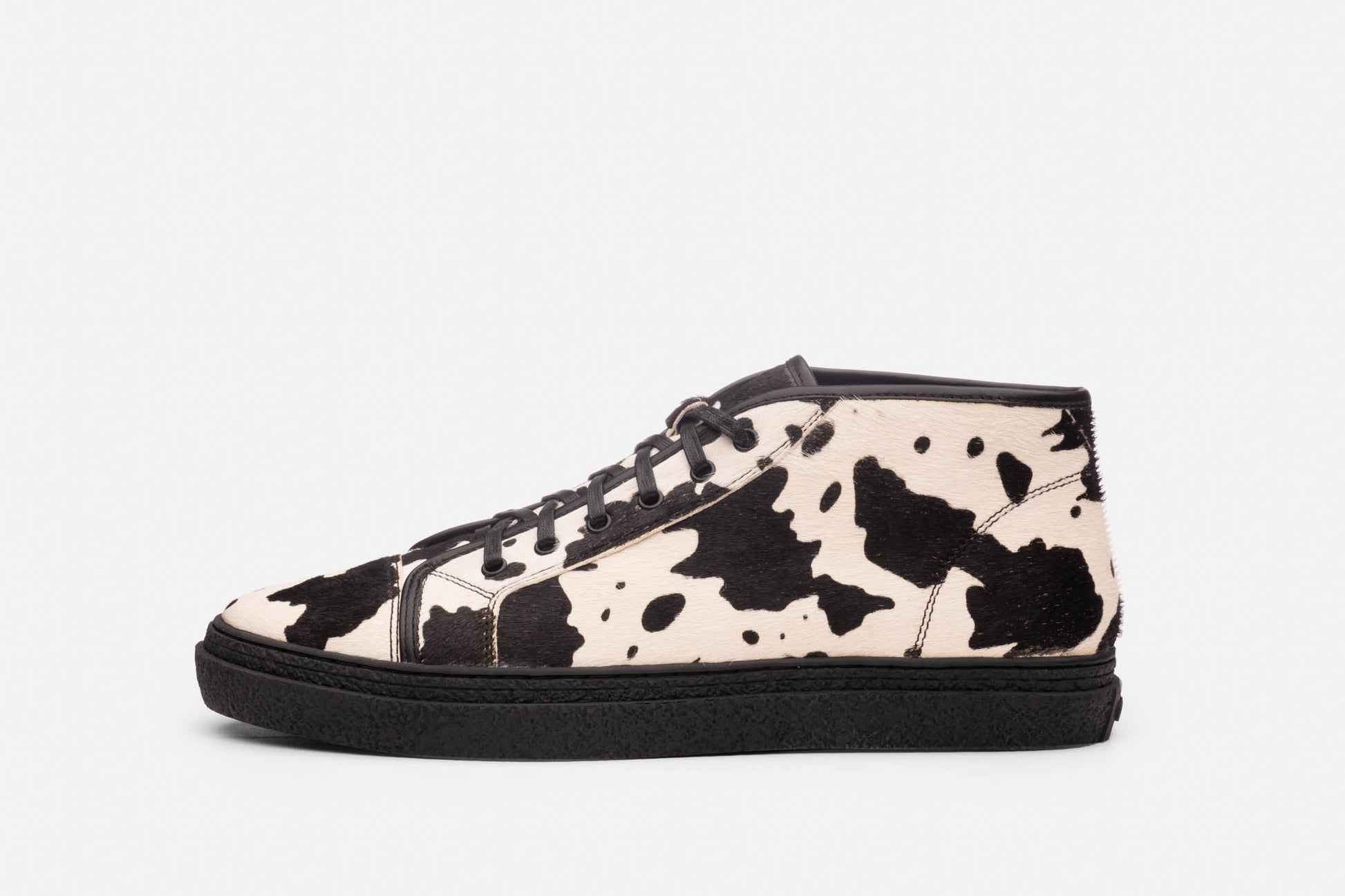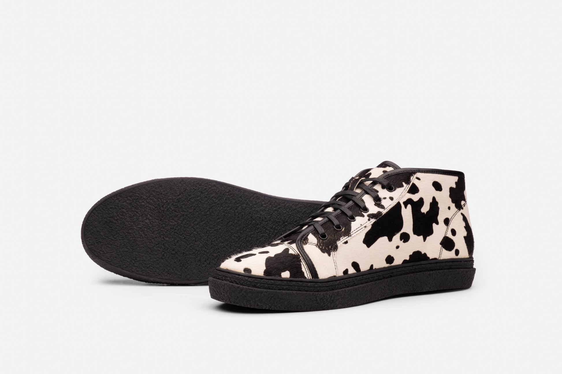 A sleek Western wear upgrade suitable for all seasons. This bold ‘Kogi’ model features genuine leather in a contemporary mid top sneaker. Designed on a European last, our lace up stands apart with it's utilitarian silhouette. Leather lining. Custom beveled faux crepe rubber outsole.