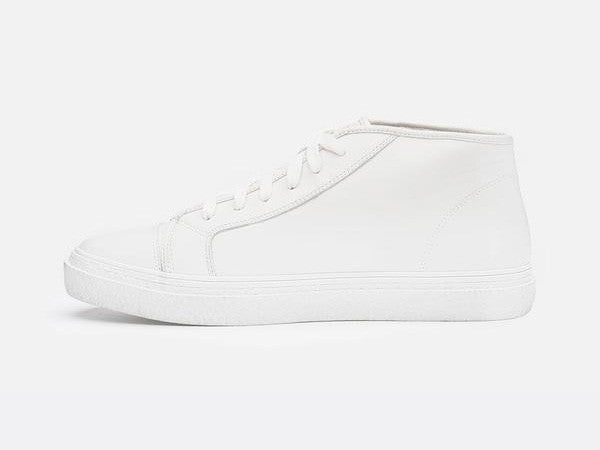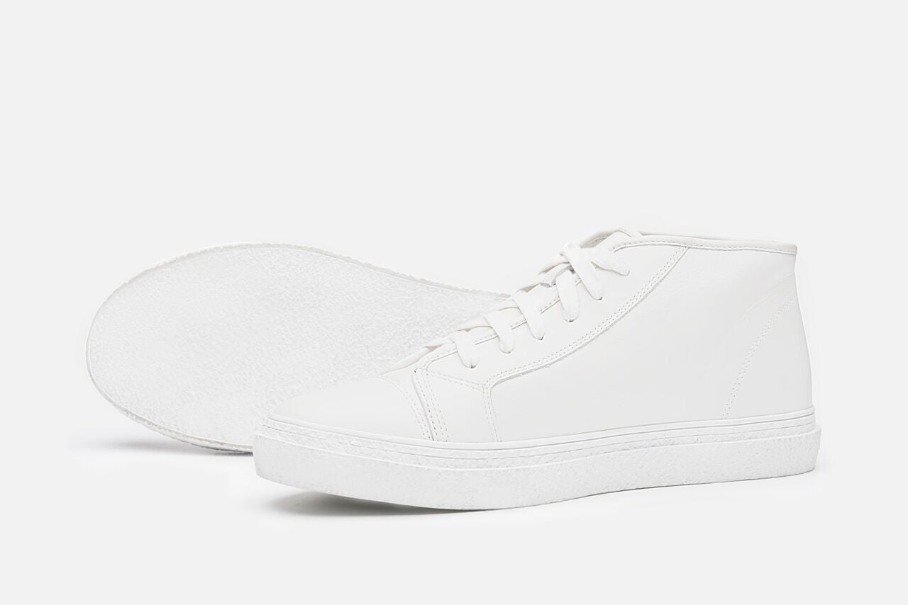 The ‘Kogi’ model features our soft hand feel, glazed leather in a contemporary mid top sneaker. Designed on a European last, our utilitarian lace up stands apart with it's unique silhouette. Leather lining. Custom beveled faux crepe rubber outsole.