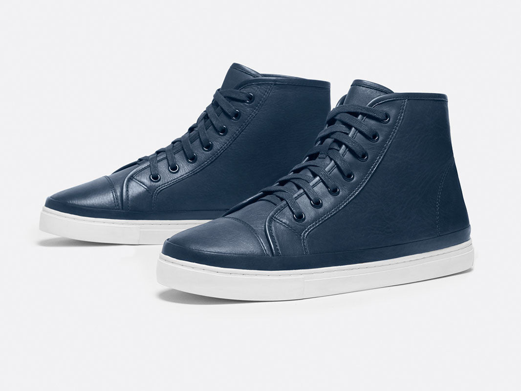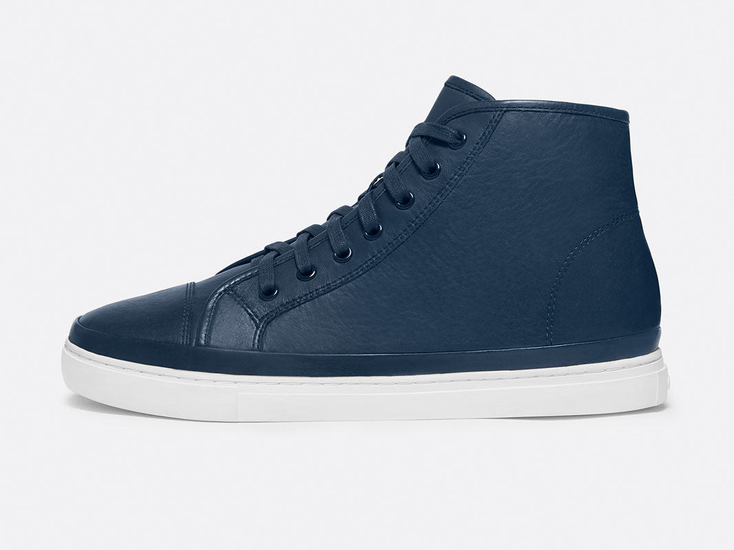 The ‘Tilden’ model is emblematic of our understated aesthetic. Made with a soft hand feel, glazed leather, these high tops were designed to instantly enhance any contemporary wardrobe. Ink Blue. Bomber orange leather lining. Custom outsole.